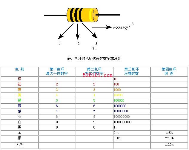 碳質電阻和一些1/8瓦碳膜電阻的阻值和誤差用色環表示。在電阻上有三道或者四道色環。*近電阻端的是第一道色環,其余順次是二、三、四道色環,如圖1所示。第一道色環表示阻值的大一位數字,第二道色環表示第二位數字,第三道色環表示阻值未應該有幾個零。第四道色環表示阻值的誤差。色環顏色所代表的數字或者意義見表1。