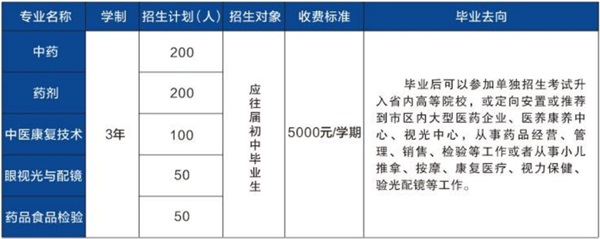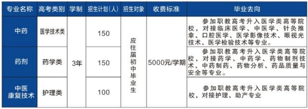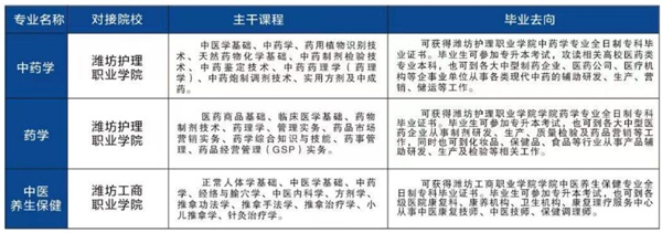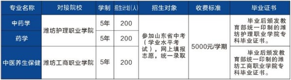 學校積極響應國家職教政策,開設“職教高考班”。經山東省教育廳批準,與濰坊護理職業學院、濰坊工商職業學院聯合舉辦“三二連讀”大專班,開設中藥學、藥學、中醫養生保健專業,進一步提升了學校的辦學層次。學校中藥專業被評為濰坊市中等職業教育品牌專業、藥劑專業被評為濰坊市中等職業教育高水平專業。