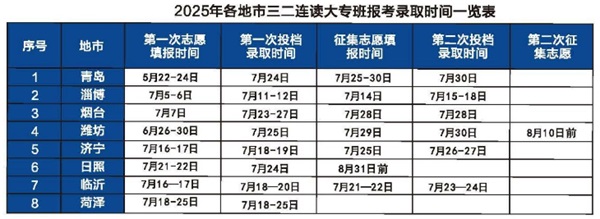 ②山東省內濰坊市外其他地市考生:學校在青島、淄博、煙臺、濰坊、濟寧、日照、臨沂、菏澤投放“三連讀”大專班招生計劃。考生需要在當地市教育局公布的時間及網站填報志愿(詳情請見下表)