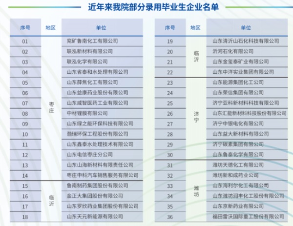 建校以來,學院已累計向社會輸送畢業生10萬余人,一大批優秀畢業生已走上技術管理或領導崗位。近幾年,學院與山東能源集團、聯泓新材料有限公司、濟南圣泉集團、山東新和成控股有限 公司、東岳集團、中材鋰膜有限公司、山東榮信煤化有限責任公司、山東魯泰化學有限公司、濟寧碳素集團有限公司、中海外能源集團有限公司、齊魯制藥有限公司、山東濱化集團責任有限公司、山東瑞星集團有限公司、山東萬達集團股份有限公司、山東博匯集團有限公司、嵐橋集團、連云港盛 虹石化有限公司、浙江石化有限公司、江蘇新海石化有限公司等省內外100余家大中型企業建立了長期用人合作關系,就業質量高,畢業生供不應求,就業率始終保持在98%以上。學院每年定期舉辦大型校園招聘會,凡我院畢業生可不限次數參加。