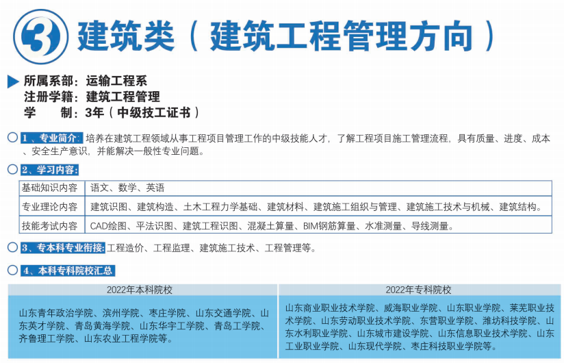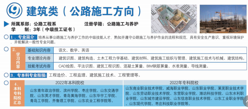 公路工程系 | 高級技工 | 公路施工與養護 | 30 | 5年(3+2):初中畢業生 | 1.免收學費。2.免收校企合作企業收取的費用。3.以系為主聯合開展校企合作,成立山東高速、中國重汽、上汽大眾、山東宏雁等知名企業訂單班、冠名班,加大校企合作力度。 |