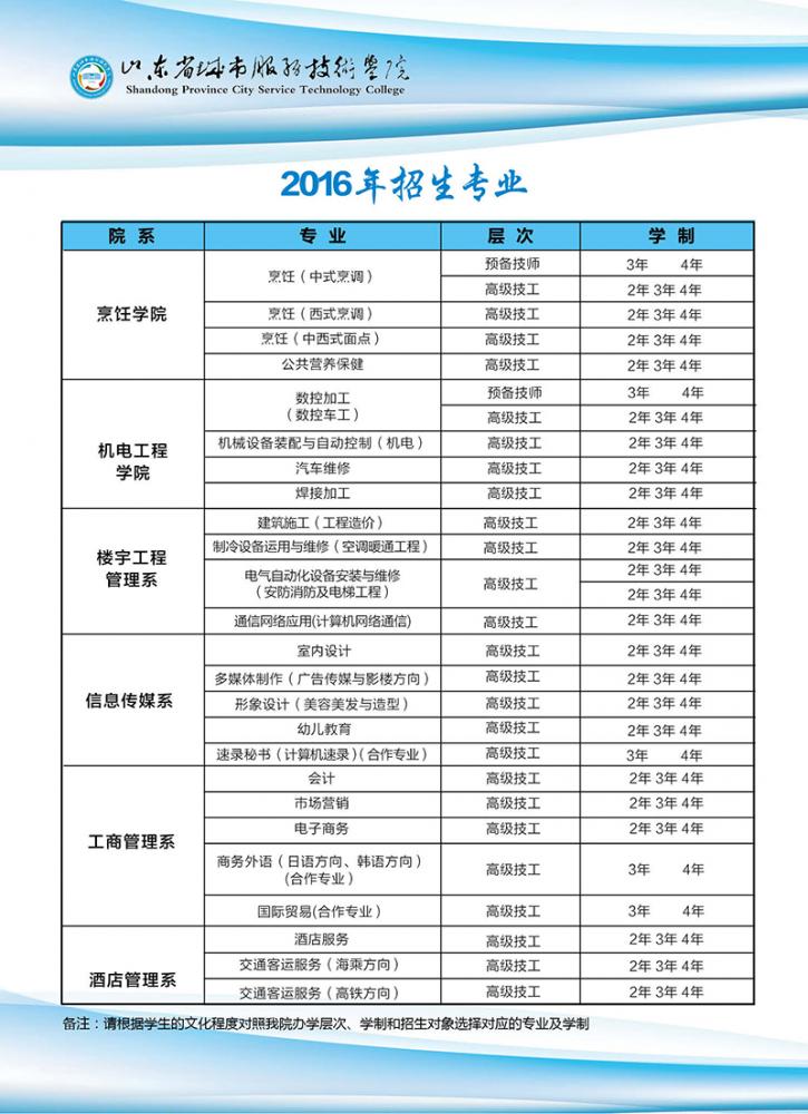 四年制高級技工:招收初中畢業(yè)生,注冊山東城市服務技術學院學籍。入學后可參加由山東城市服務技術學院組織的入學考試,取得學籍。