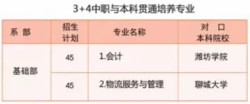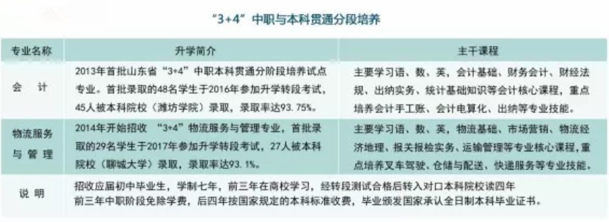 3、3+4中職與本科貫通培養(yǎng)學(xué)生三年中職階段后經(jīng)過測試合格可升入濰坊學(xué)院或聊城大學(xué)讀四年,取得本科學(xué)歷。
