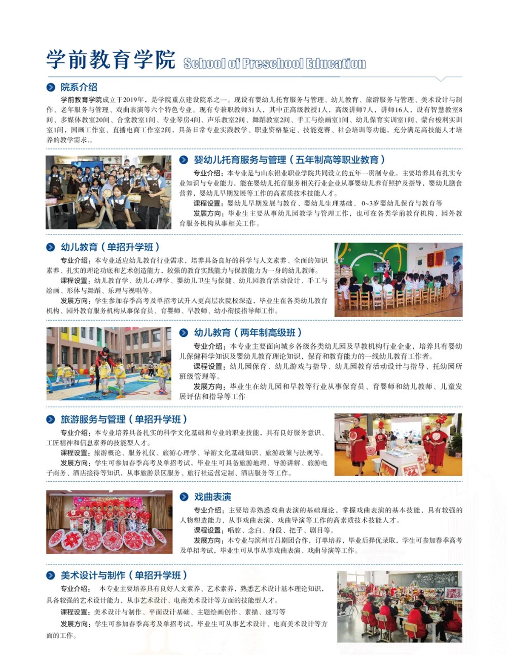 冠名企業:濱州經濟開發區小太陽禮儀幼兒、山東濱盛文旅體育產業集團有限公司、濱州市呂劇團 主要合作企業:山東濱盛教育發展有限公司、濟南融創銘晟文化產業有限公司、濱州經濟開發區秦皇麗景幼兒園,濱州經濟開發區雙清教育幼兒園,濱州慧業服研學有限責任公司等幼兒園及旅游文化類企業 呂劇團訂單班:畢業后擇優錄取成為濱州呂劇團正式員工 |