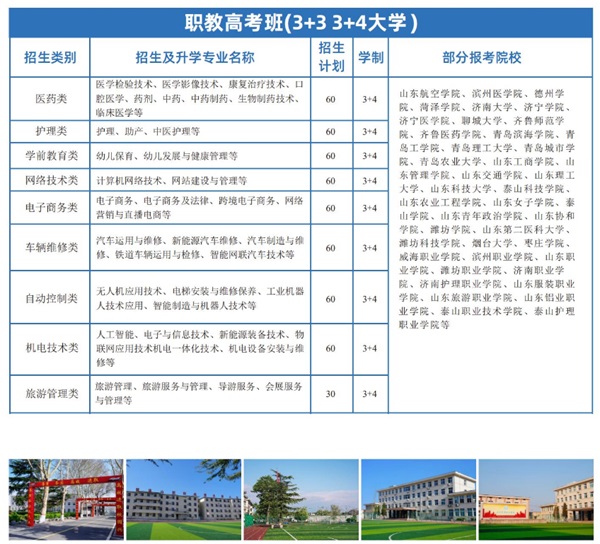 山東職業(yè)技工學(xué)校于2005年經(jīng)山東省人社廳批準(zhǔn)成立,占地面積180余畝,建筑面積5萬(wàn)余平,現(xiàn)有在校生2000余人,教職工100多人,其中具有副高級(jí)專業(yè)技術(shù)職務(wù)的31人,“雙師型”教師33人,F(xiàn)開設(shè)工業(yè)機(jī)器人、無(wú)人機(jī)應(yīng)用技術(shù)、消防工程技術(shù)、機(jī)電一體化專業(yè)、護(hù)理專業(yè),學(xué)前教育、酒店管理、汽車維修、網(wǎng)絡(luò)應(yīng)用技術(shù)、電子商務(wù)等專業(yè)。學(xué)校與河北衡博高級(jí)中學(xué)合作,打造衡水模式卓毅班,開設(shè)普通高中課程,為不同基礎(chǔ)的同學(xué)鑄造夏季高考、高考復(fù)讀和職教高考的圓夢(mèng)階梯。