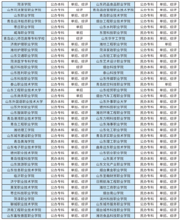 山東省春季高考招生包括春季高考統一考試招生、高職(專科)單獨考試招生和高職(專科)綜合評價招生三種類型。