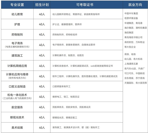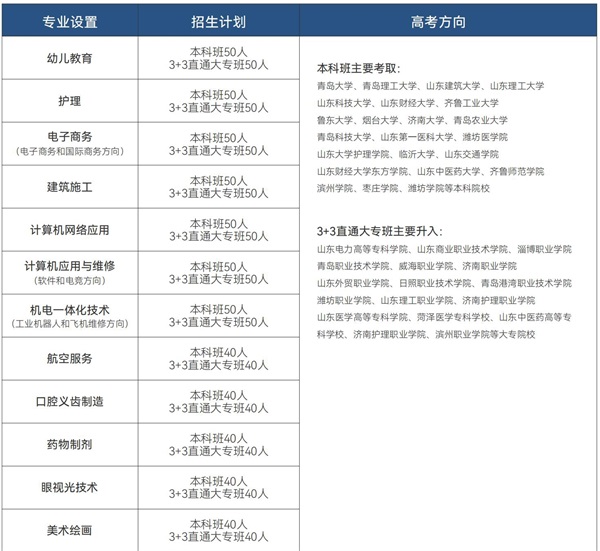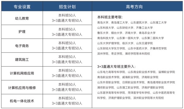 通過三年學習,升入山東科技職業學院、濟南職業學院、日照職業技術學院、青島港灣職業技術學院、青島工程職業學院等高職院校繼續深造:大專畢業后可參加專升本,考取本科。